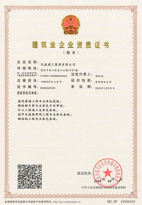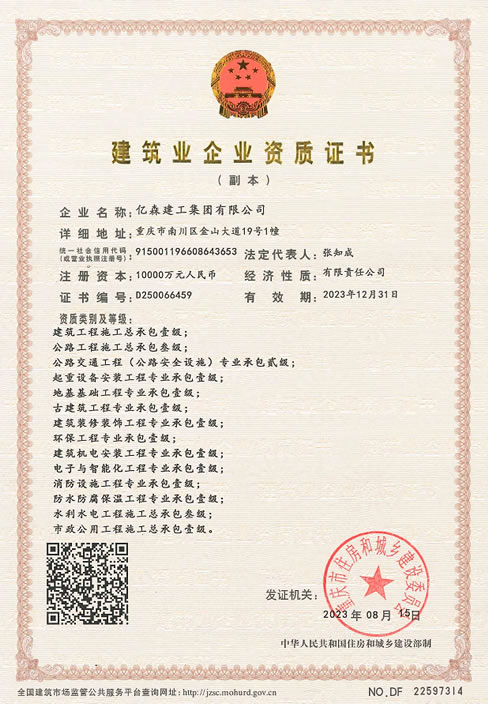 ?建筑工程施工總承包壹級(jí) ?市政公用工程施工總承包壹級(jí) ?建筑裝修裝飾工程專業(yè)承包壹級(jí) ?環(huán)保工程專業(yè)承包壹級(jí) ?電子與智能化工程專業(yè)承包壹級(jí) ?消防設(shè)施工程專業(yè)承包壹級(jí) ?防水防腐保溫工程專業(yè)承包壹級(jí) ?建筑機(jī)電安裝工程專業(yè)承包壹級(jí) ?地基基礎(chǔ)工程專業(yè)承包壹級(jí) ?起重設(shè)備安裝工程專業(yè)承包壹級(jí) ?古建筑工程專業(yè)承包壹級(jí) ?公路交通工程(公路安全設(shè)施)專業(yè)承包貳級(jí) ?建筑幕墻工程專業(yè)承包貳級(jí) ?水利水電工程施工總承包貳級(jí) ?公路工程施工總承包貳級(jí) ?礦山工程施工總承包貳級(jí) ?城市及道路照明工程專業(yè)承包貳級(jí) ?鋼結(jié)構(gòu)工程專業(yè)承包貳級(jí) ?模板腳手架專業(yè)承包不分等級(jí)